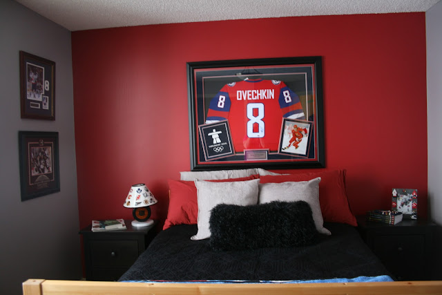 Originally, the wall to the right of the bed had been painted red, but with the bunk beds and the armoire now gone, it made good sense to make the far wall the red accent wall to feature the bed and the cherished, framed hockey print of Ovechkin.
